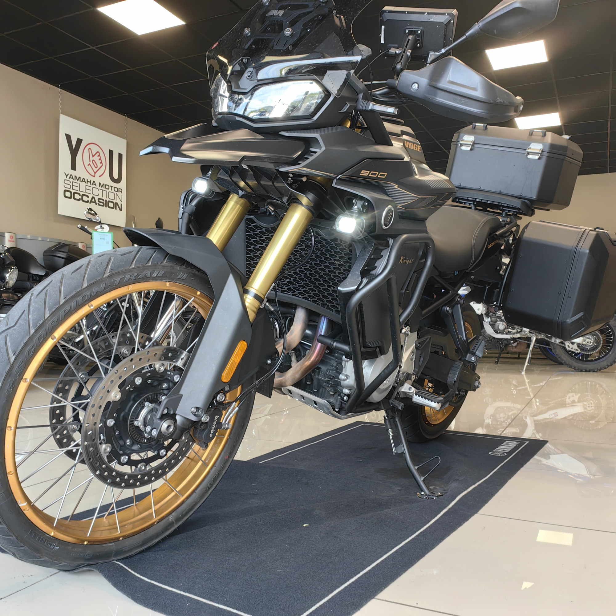 IMU (Unité de Mesure Inertielle) Ecran TFT 7 pouce QSS (Quick shifter up & down) Pare-brise réglable en hauteur Bluetooth Caméra frontale Prises USB et 12V Porte paquet arrière Protèges carters Régulateur de vitesse Capteur de pression des pneus TPMS (Tyre Pressure Moritoning Sensor) Détecteur de présence de véhicule Etriers BREMBO Ride by wire (accélérateur électronique) TCS Cornering ABS (freinage optimisé en virage) ABS double canal (Déconnectable en mode Enduro pro) Embrayage anti-dribble Indicateurs: rapport engagé Température extérieure Pneus PIRELLI RALLY SCORPION